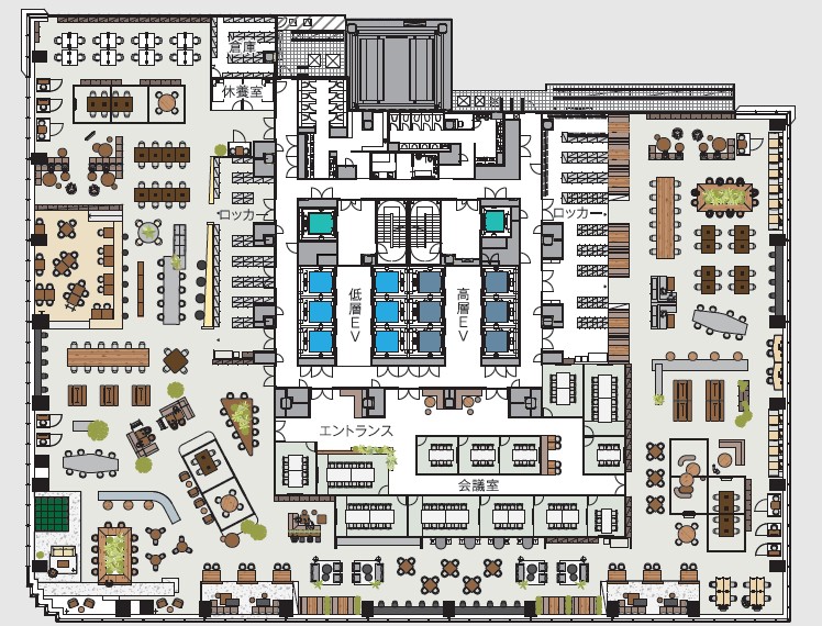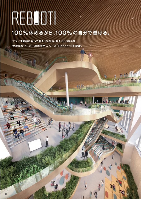 オフィス面積15%(1,300坪)を締める、Reboot!(テナント専用共用施設)では、日々変動する働き方に対し最新の取り組みをご提供しております。