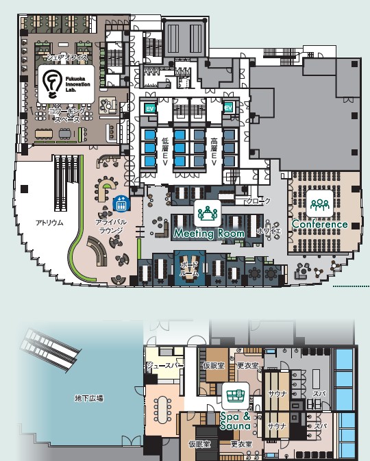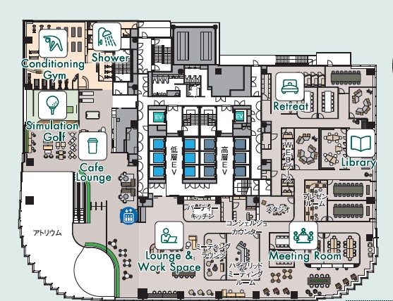 サウナやジム、シュミレーションゴルフ等ワーカーの活力を高める機能に加え、チームビルディング・テナント間の交流を促進する施設として