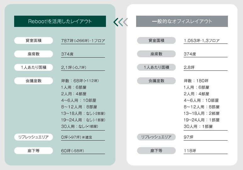稼働率の少ない会議室や従業員の休憩スペースをReboot!に充てることで、必要面積の2~3割カットが可能となっております。
