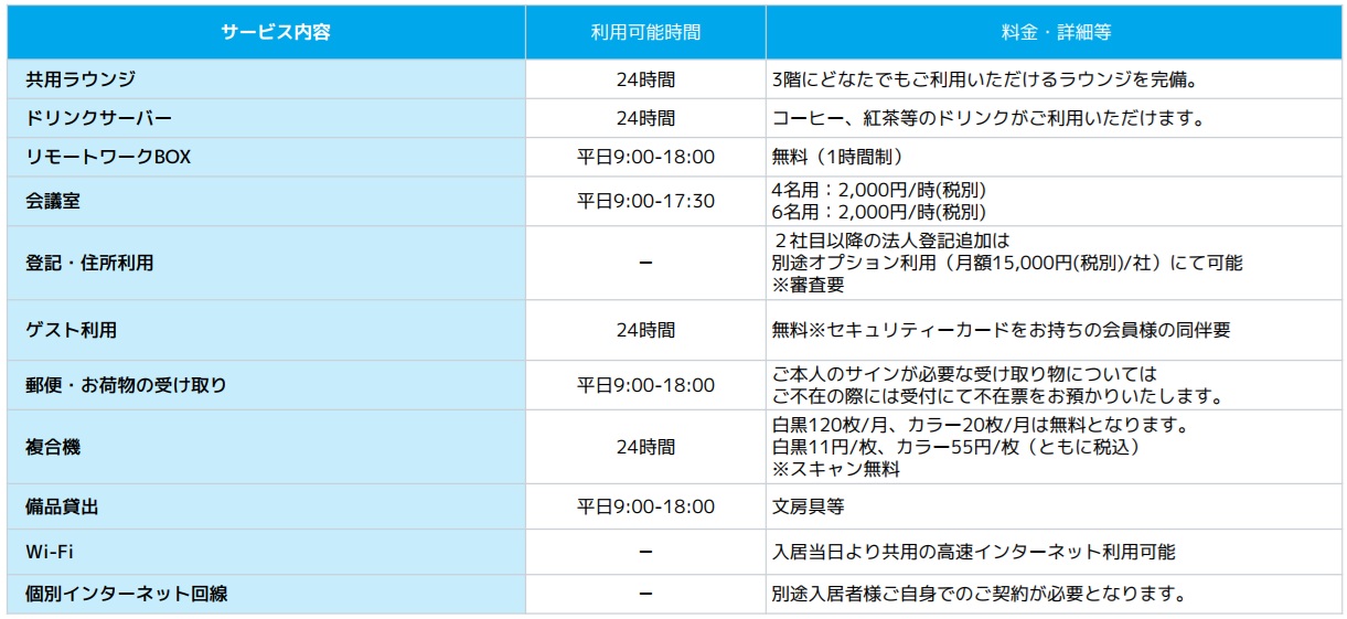 高速インターネット、複合機、ドリンクサービスはもちろん、円滑にビジネスを進めるためのサービス・設備を整えております。