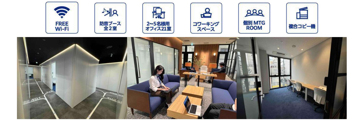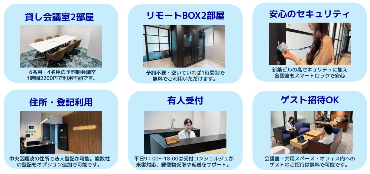 なんばエリアで、小規模・リーズナブル・清潔感のある運営サービスもしっかりしたオフィスをお探しの方にオススメの、2025年にオープンしたばかりの新しいレンタルオフィスです。