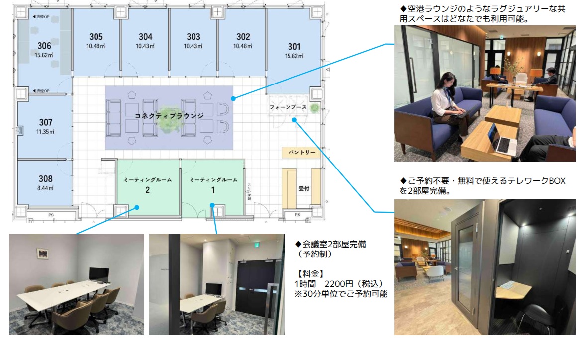 受付、ラウンジ、貸会議室、テレワークボックス、パントリーなどです。