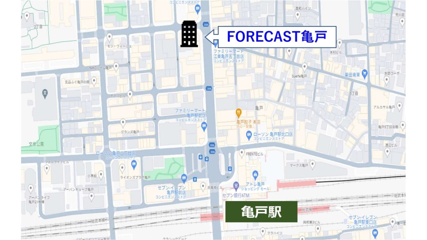 FORECAST亀戸は明治通り沿いの角地に立地し、ガラス張りの外観による高い視認性が特徴のオフィスビルです。